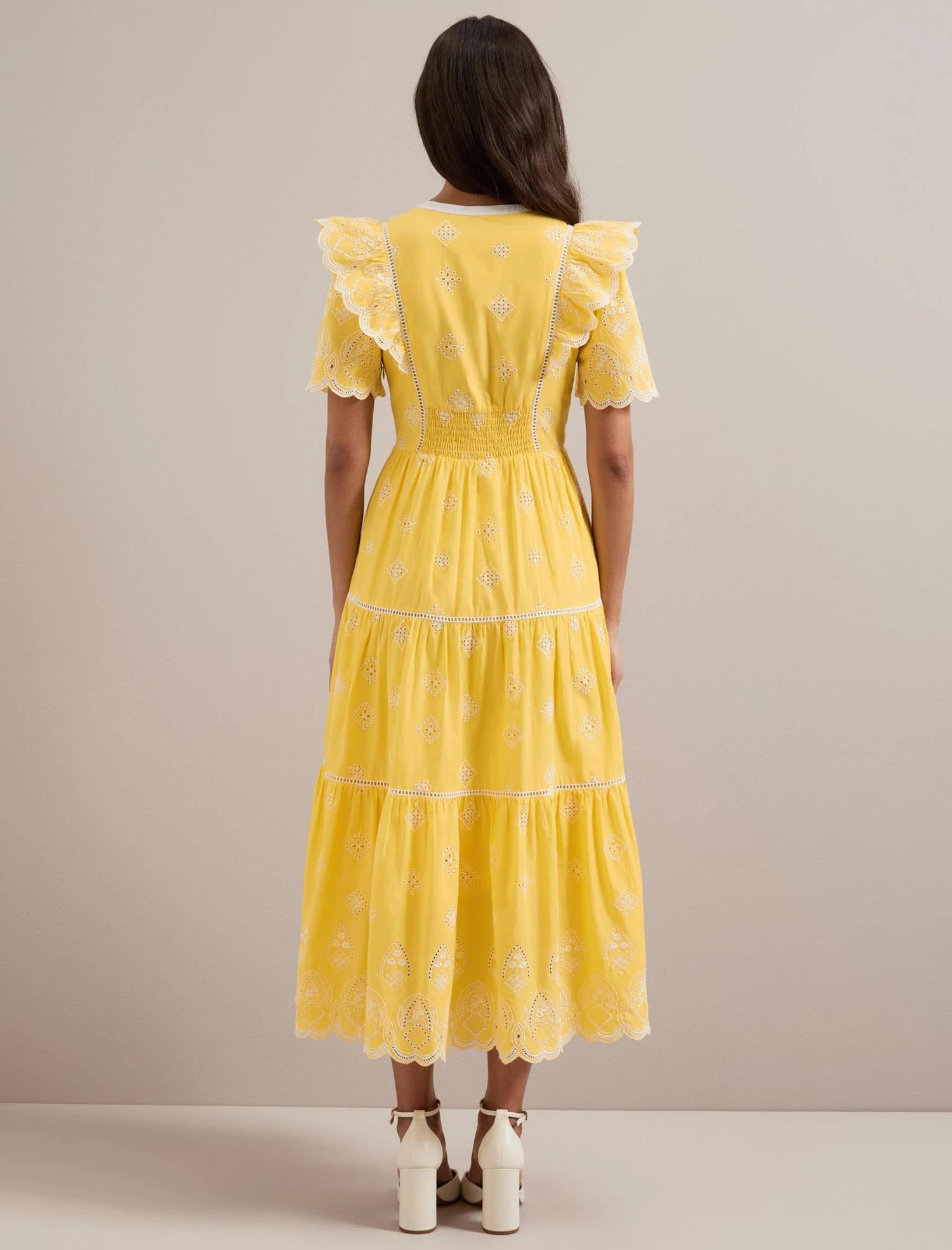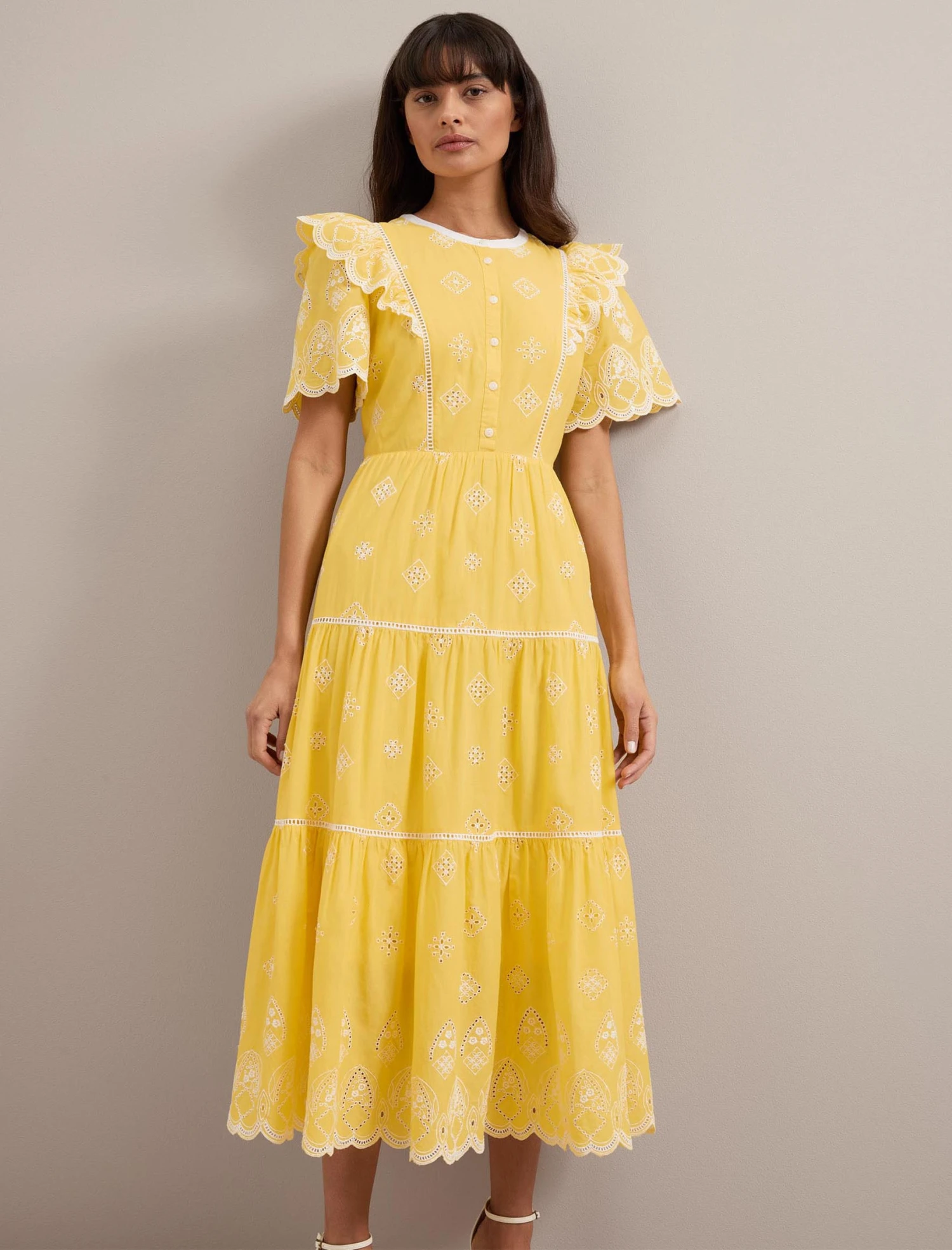 Beautiful buttercup yellow broderie anglaise makes Alana the perfect partner for long sunshine-filled days. Easy to wear in warmer climes thanks to its elasticated back and super-soft lightweight washed cotton, it features feminine frills, ladder trim detailing and a full, swishy skirt with scalloped hem. A dress with stand-out serotonin-boosting properties, she’s the perfect +1 for summer weddings, Wimbledon, Ascot and more!