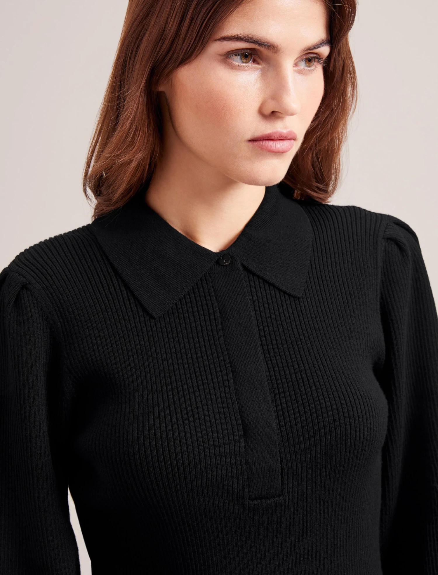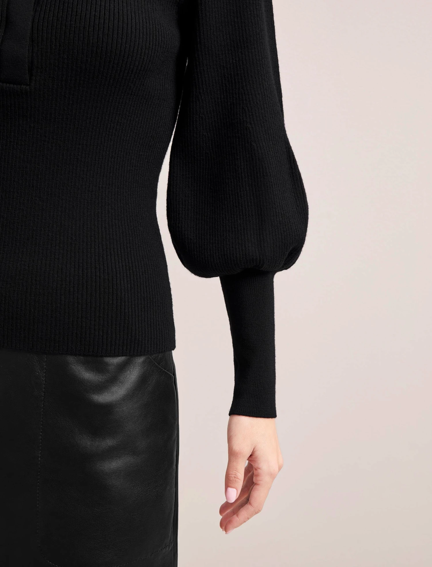 We’ve reworked our hero Eva top for FW23 with a polo-style neckline for effortless versatility. It’s designed in a soft merino-wool rib with added stretch to create a slimming silhouette, while the fitted cuff blouson sleeves add shape and volume. The perfect knit for when you want to feel pulled together, wear it with our leather Tiana skirt or any of our tailored trousers.