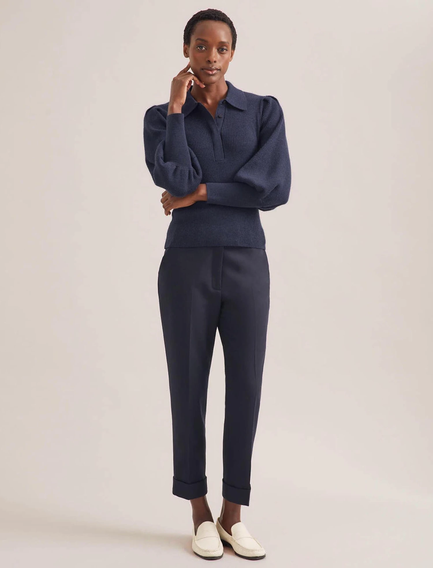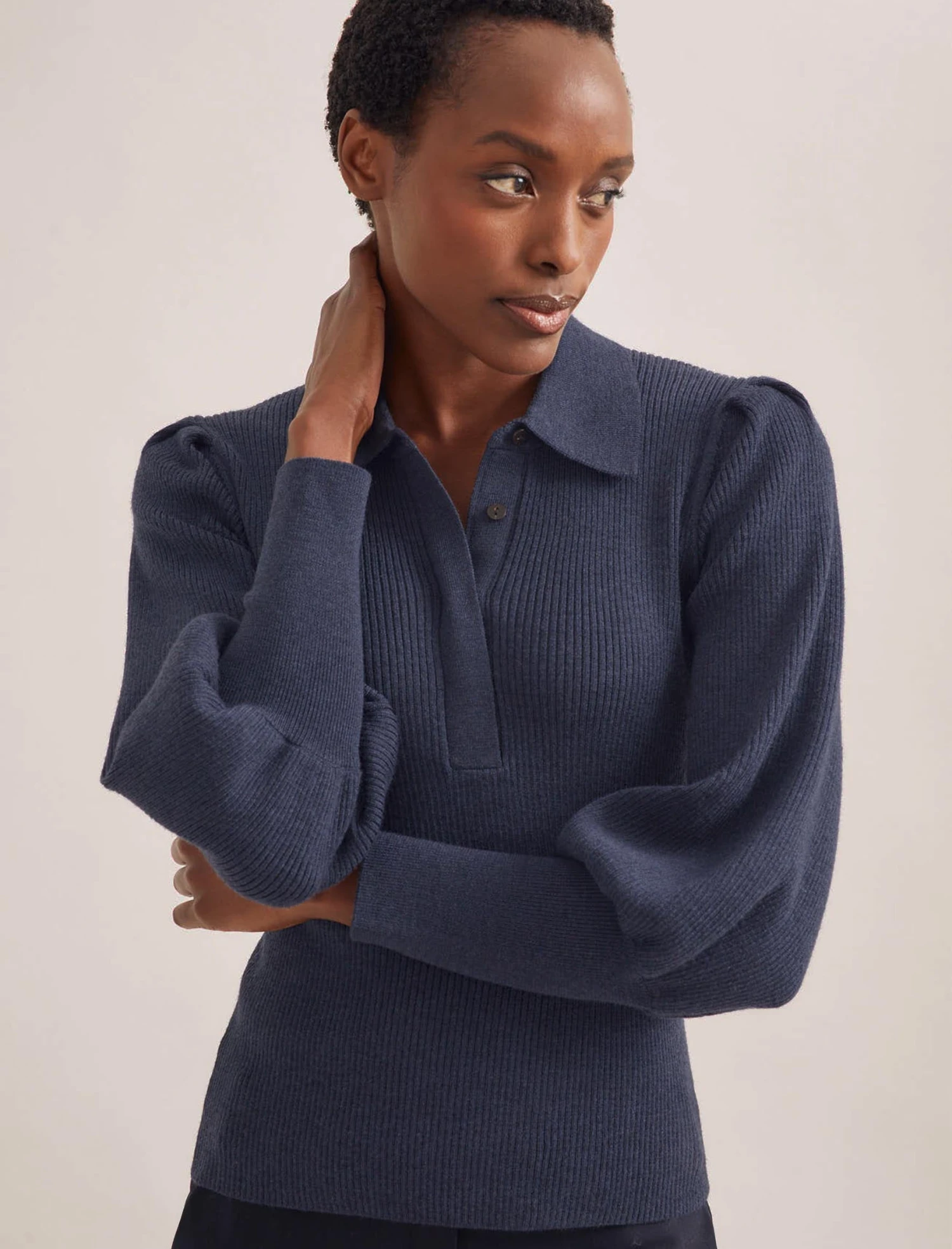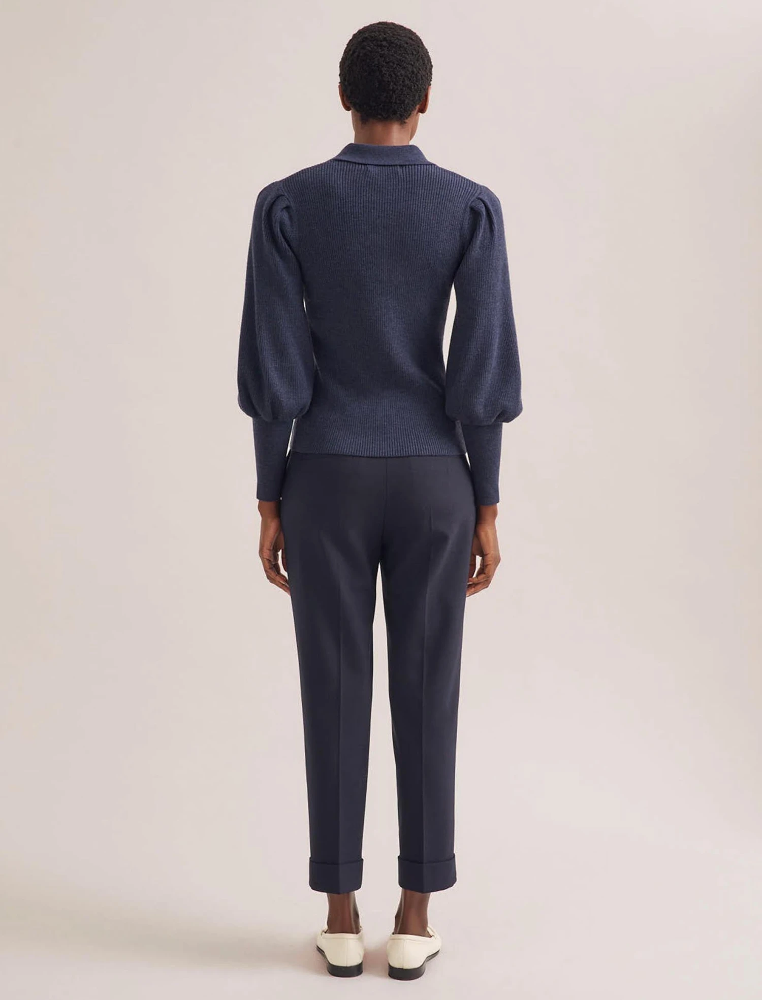 Weβve reworked our hero Eva top for FW23 with a polo-style neckline for effortless versatility. Itβs designed in a soft merino-wool rib with added stretch to create a slimming silhouette, while the fitted cuff blouson sleeves add shape and volume. The perfect knit for when you want to feel pulled together, wear it with our leatherΒ TianaΒ skirt or any of our tailored trousers.