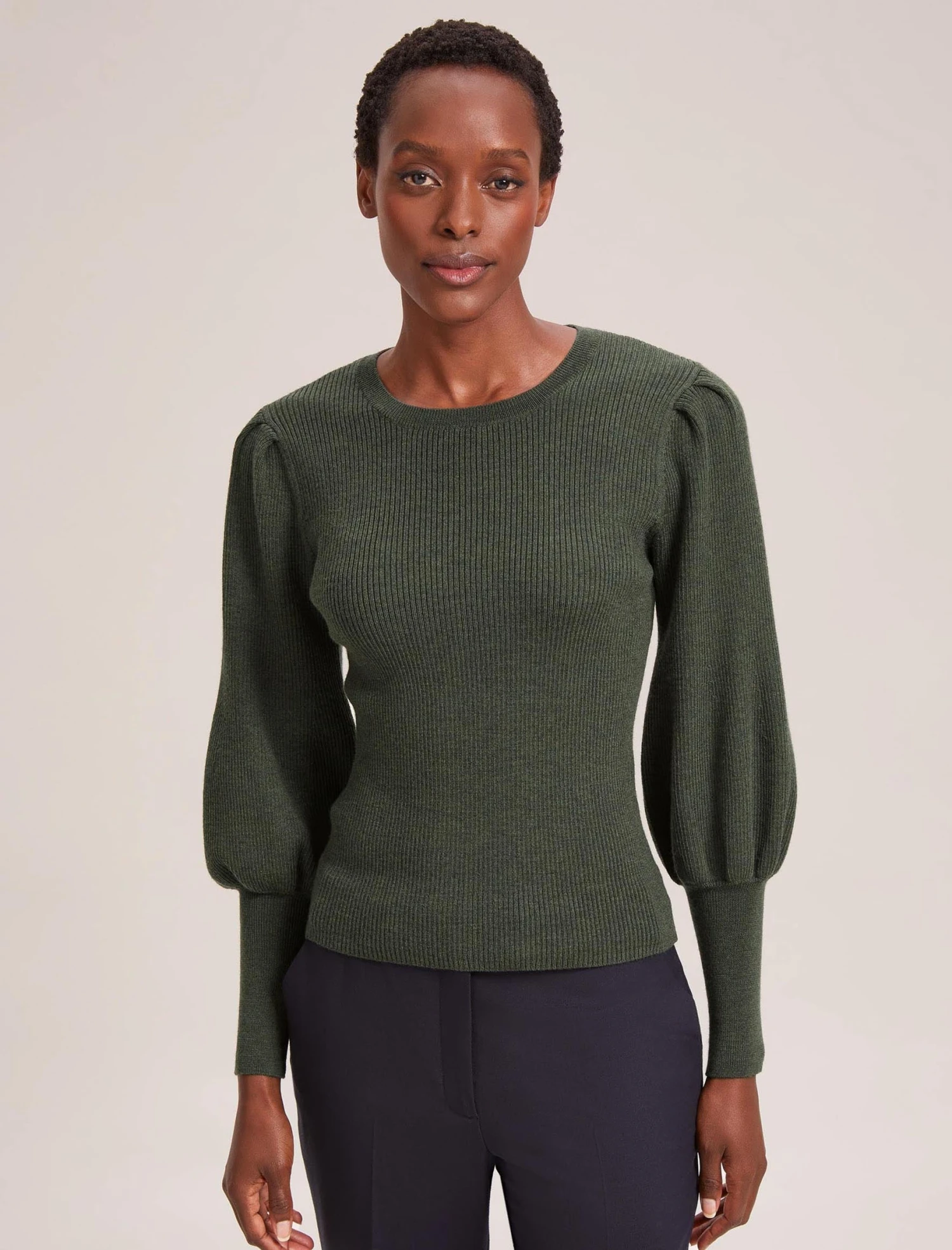 We’ve reworked our hero Eva style with a classic crew neckline for effortless versatility. The merino rib creates a slimming silhouette, while the fitted cuff blouson sleeves add feminine shape and volume. The ultimate pulled together knit, the Eva is the perfect alternative to a jacket and shirt. Wear with our leather Tiana skirt or any of our tailored trousers.