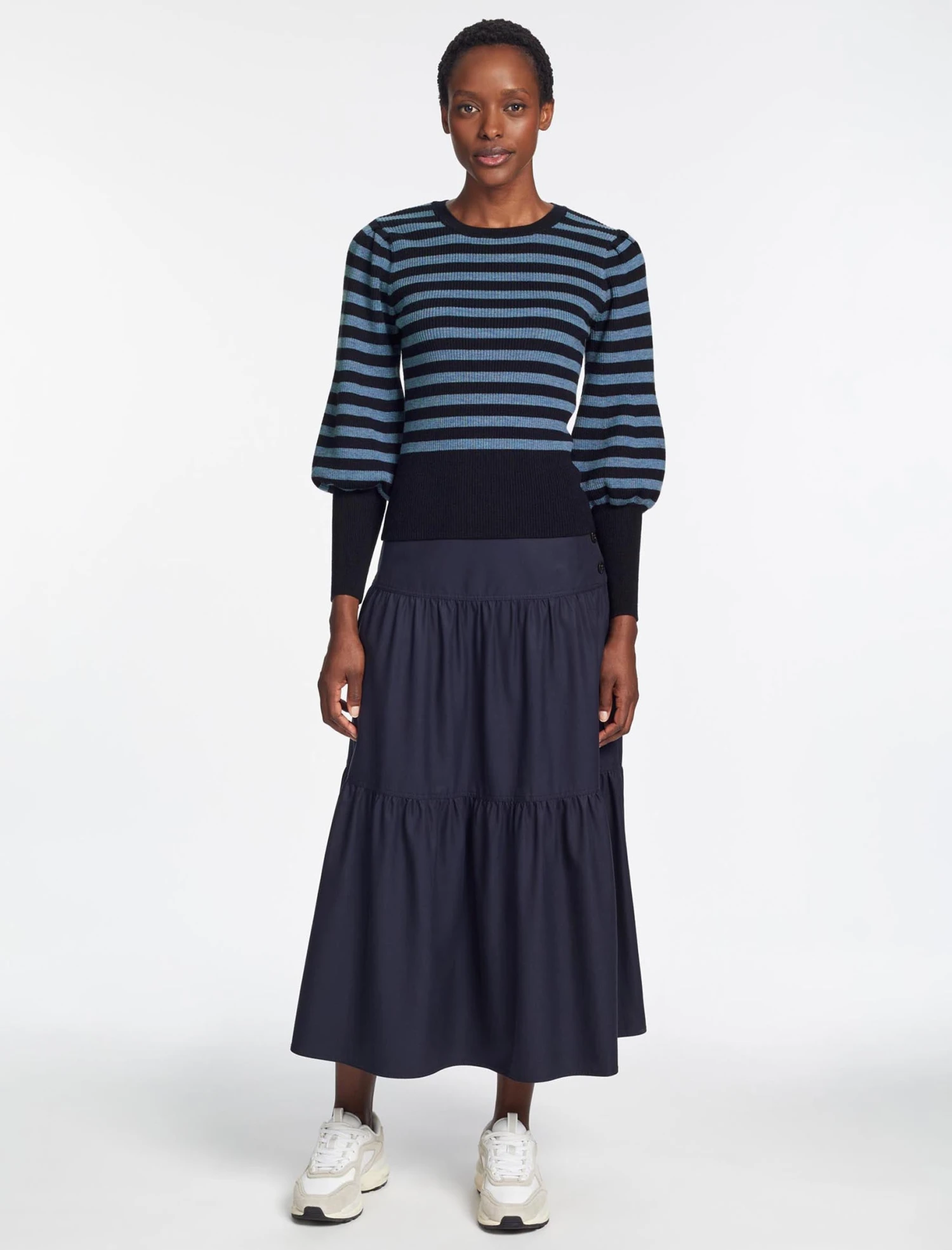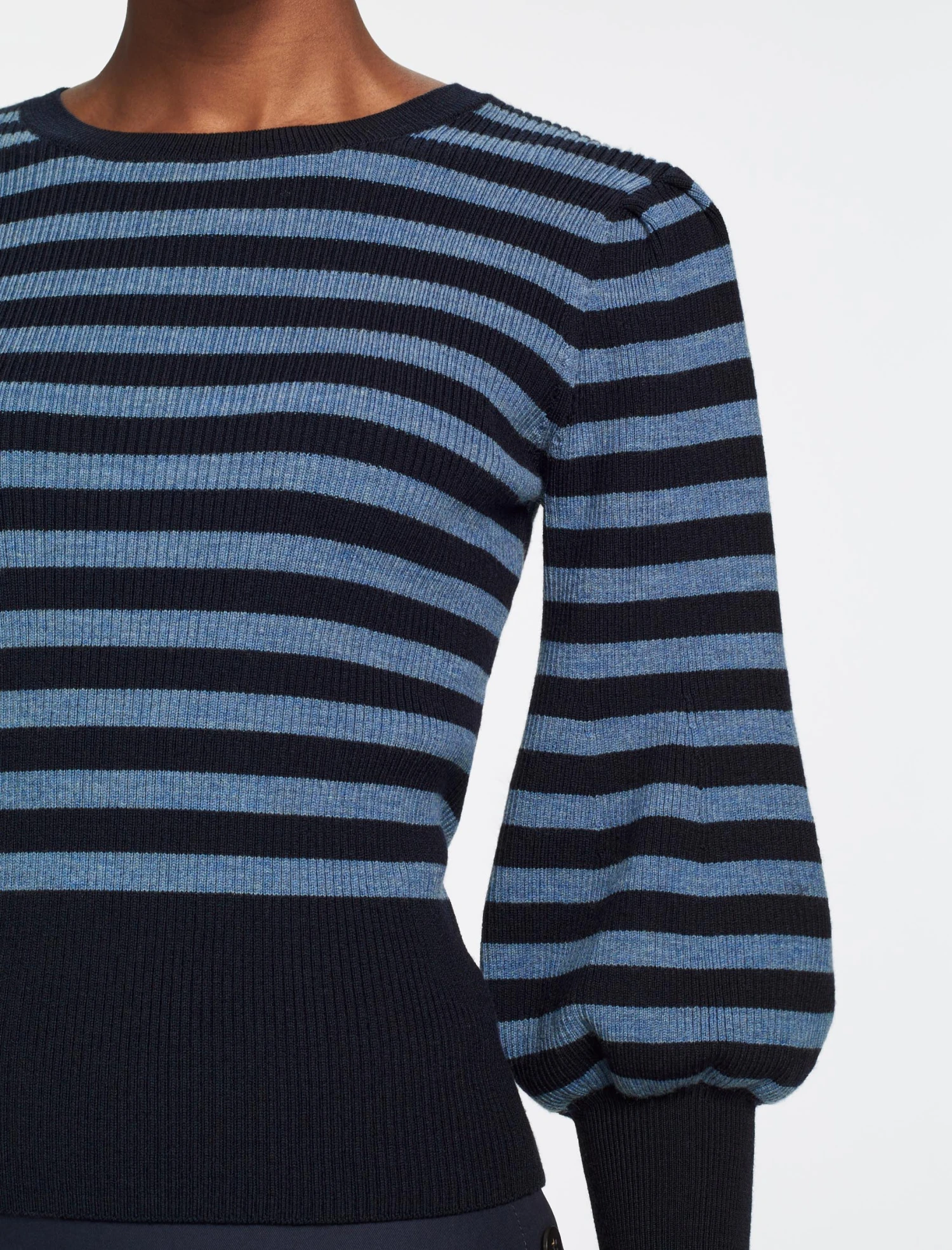 We’ve reworked our hero Eva style with a classic crew neckline for effortless versatility. The merino rib creates a slimming silhouette, while the fitted cuff blouson sleeves add feminine shape and volume. The ultimate pulled together knit, the Eva is the perfect alternative to a jacket and shirt. Wear with our leather Tiana skirt or any of our tailored trousers.
