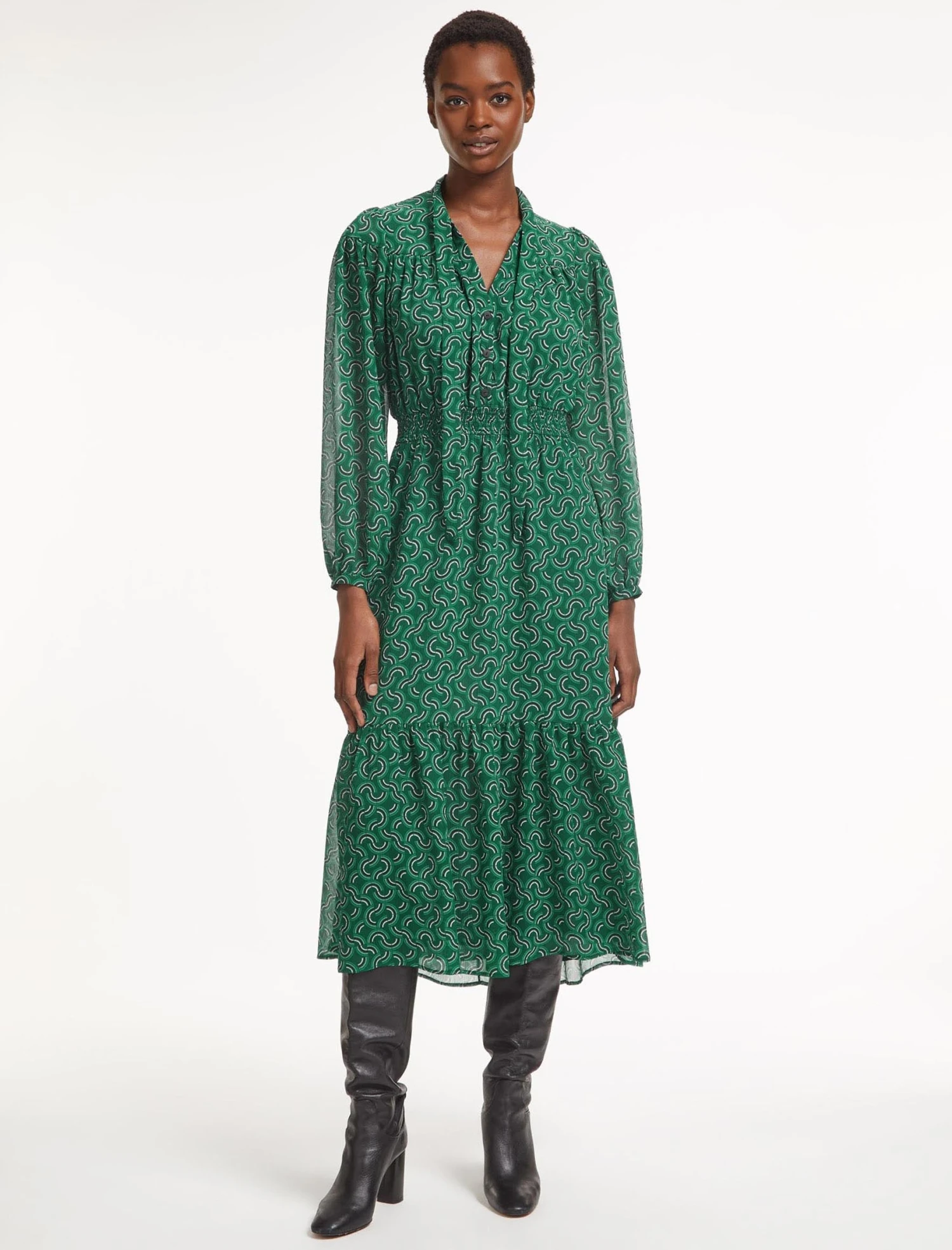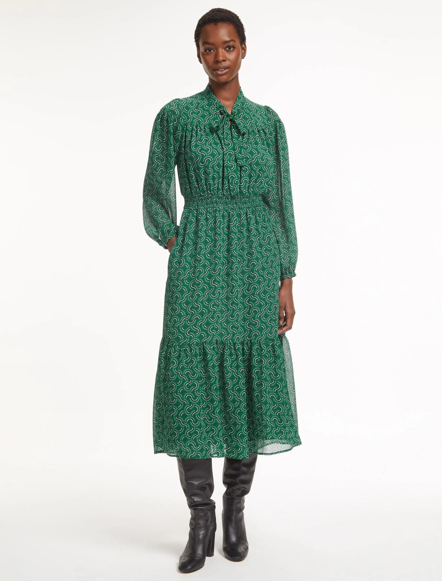 How to sum up Francesca in one word? Effortless. Designed in a machine-washable, recycled georgette with our graphic geo print, it’s crease-resistant and easy to wear, making it ideal for working days and busy autumn weekends. Add to that the shirred waist, loose necktie, midi length and pockets, and you have a fail-safe style that you’ll return to again and again.