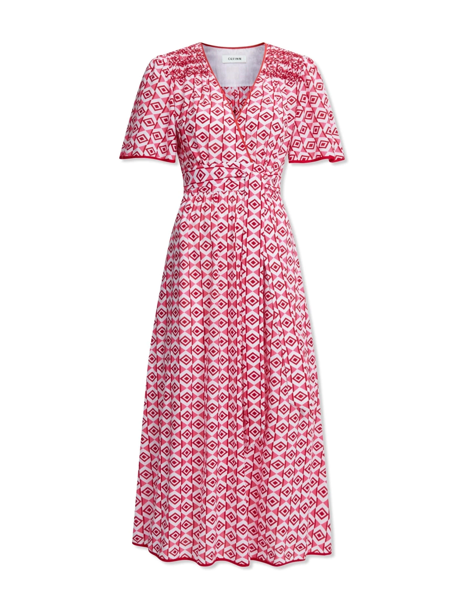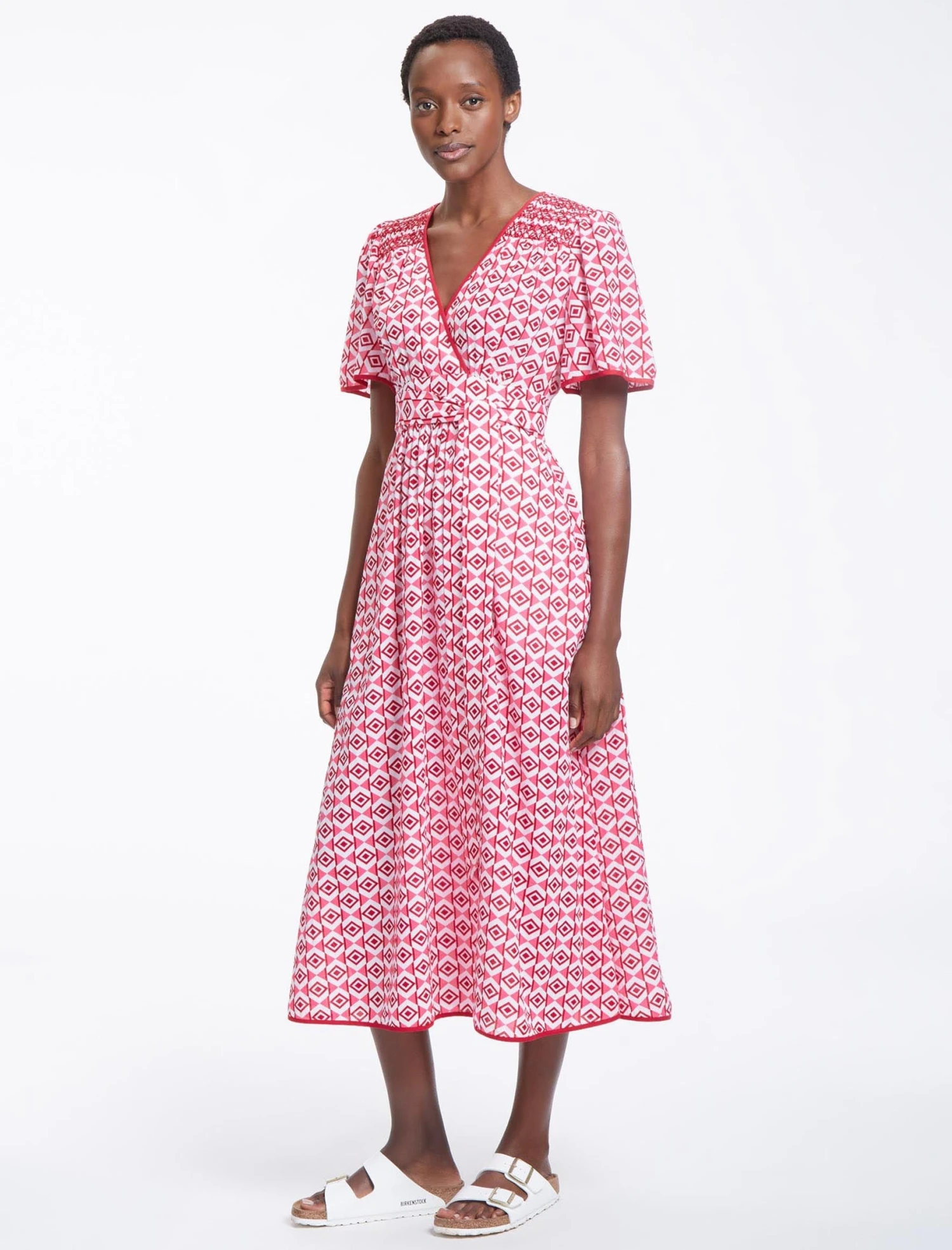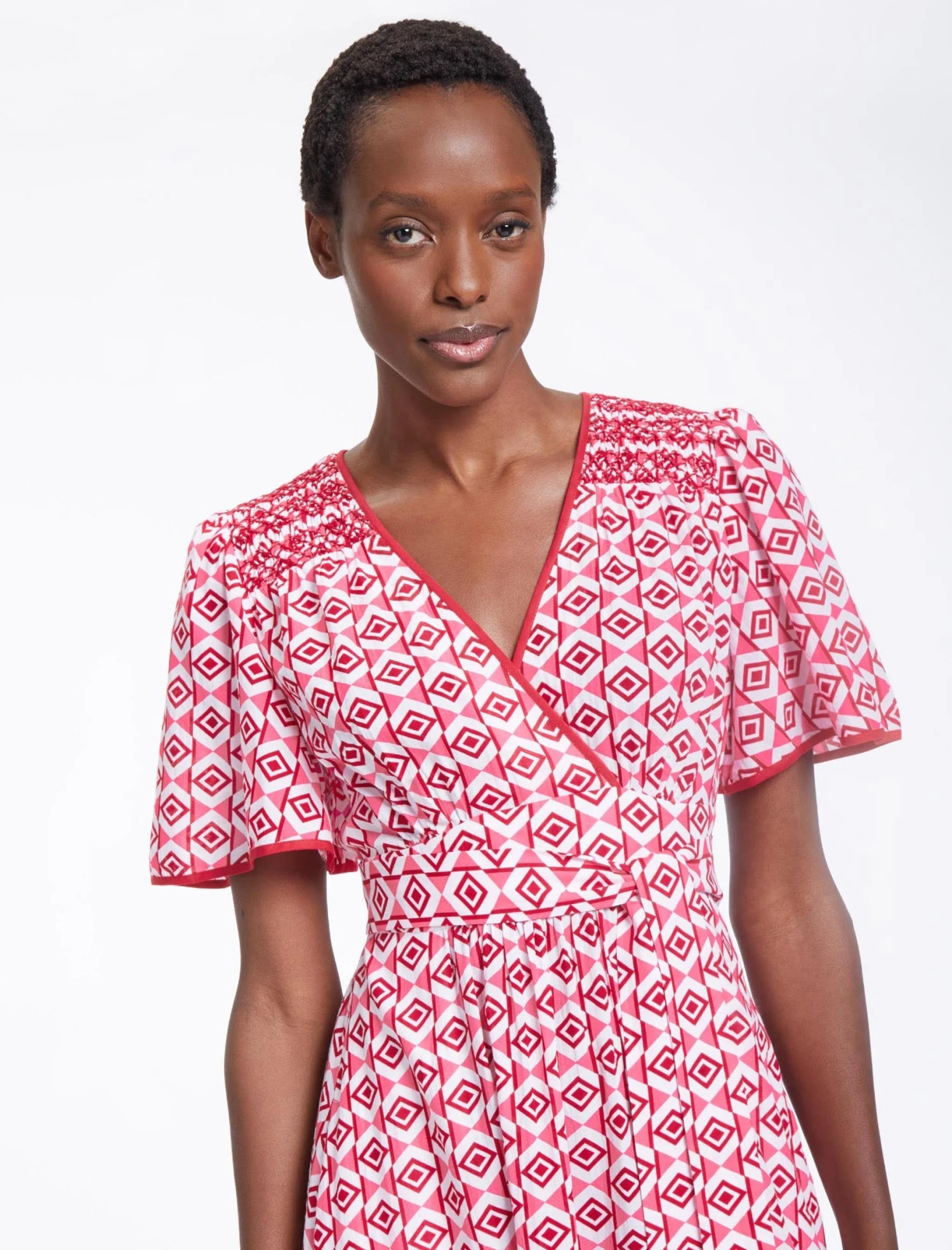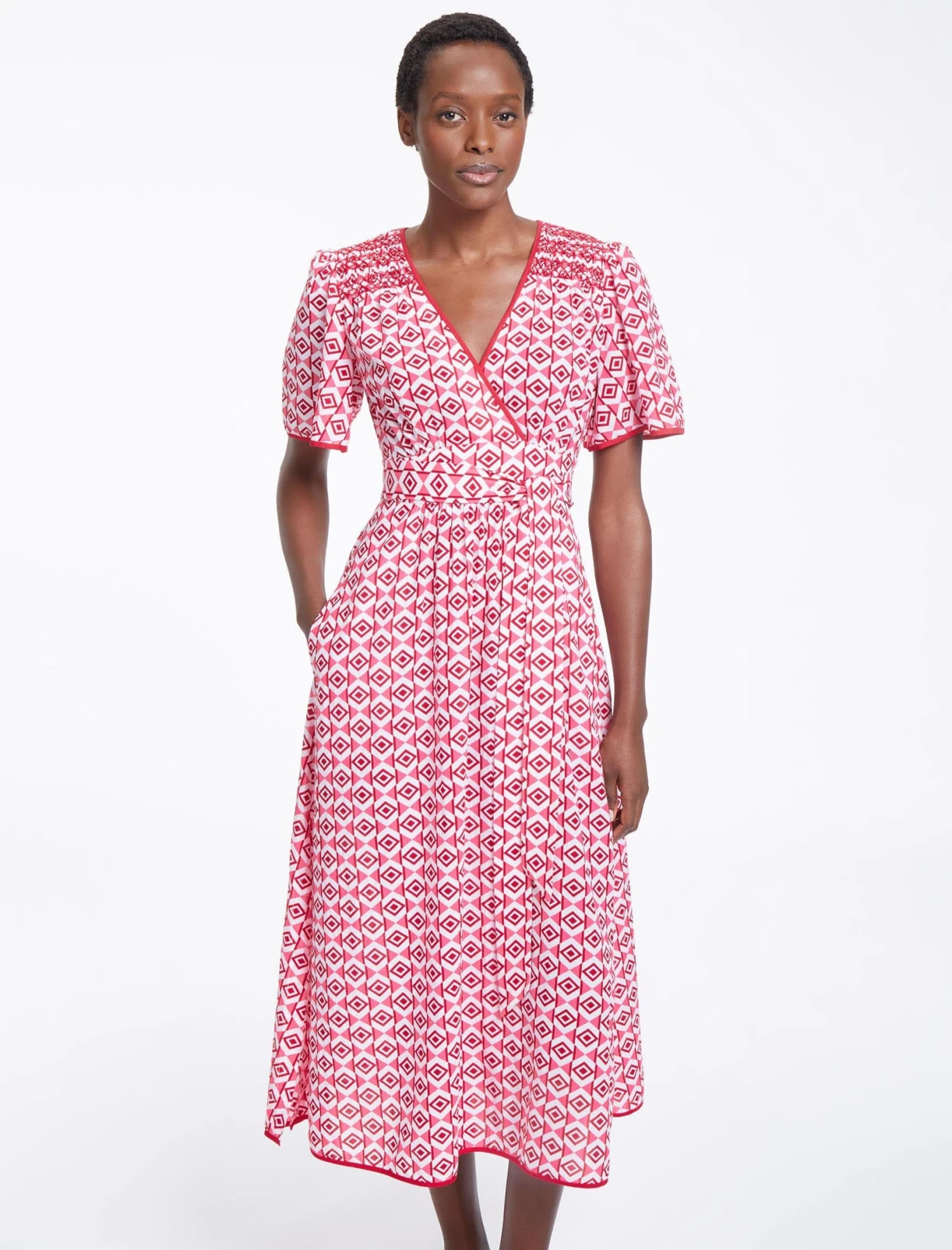 The spring/summer months call for throw-on-and-go dresses that can navigate garden parties, fundraising lunches and board meetings. Enter, then, Gina. Designed in a lightweight cotton blend in our graphic geo print, this is an effortlessly wearable dress thanks to its simple design and fuss-free detailing. The fixed wraparound sash can be tied to cinch the waist as you like, and the side slits enhance its easy elegance.