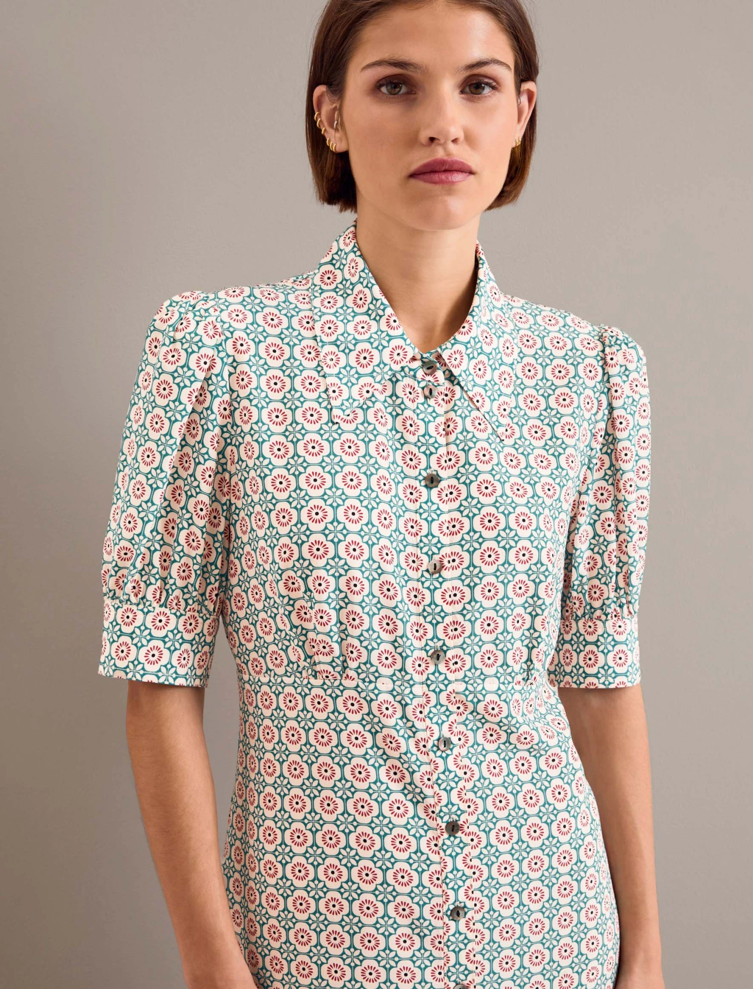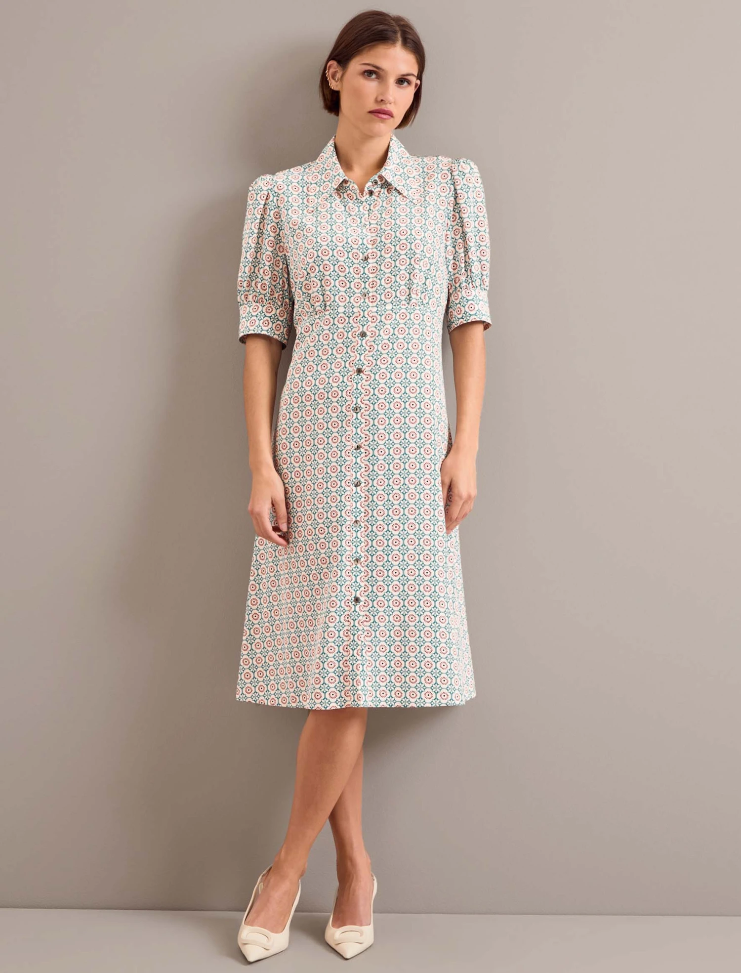 Perfect for petites or those who love a knee length, Ivy is your cut-above-the-rest tea dress. Designed in the highest quality silk crepe de chine, the sharper collar and cuff are softened by the pretty gathered sleeve and yoke. The summarys are stitched down through the bust and waist to prevent gaping but can be opened at the bottom for extra sexiness.