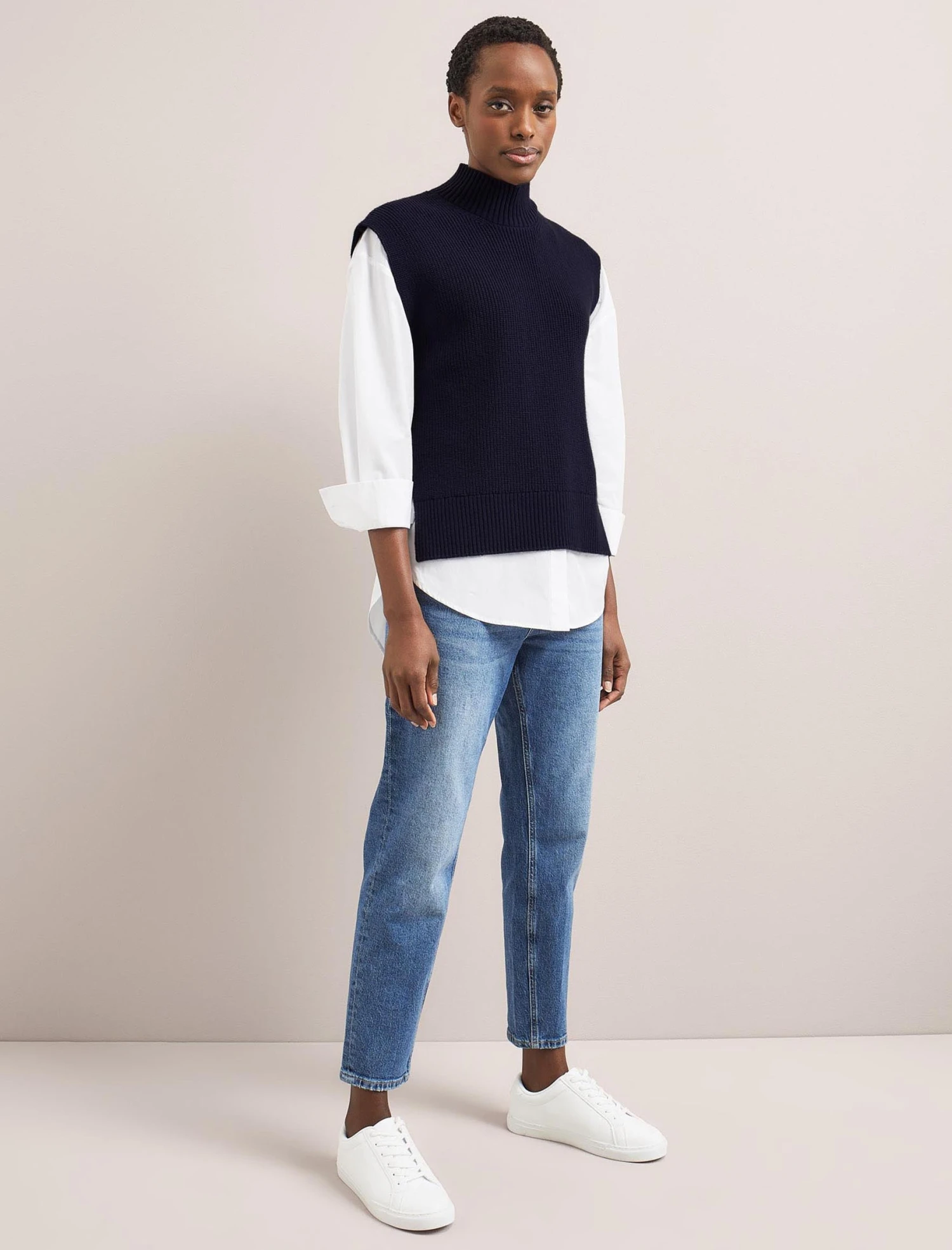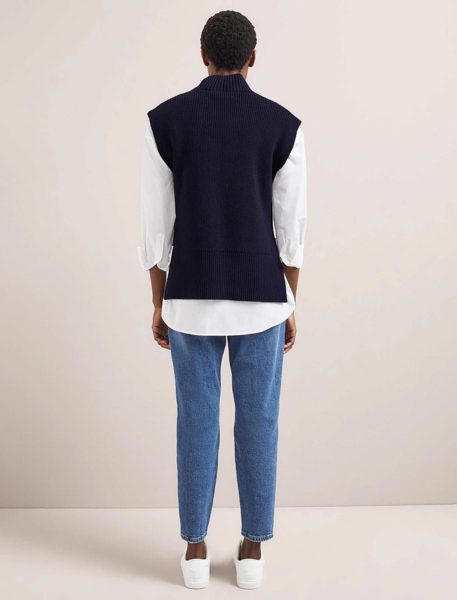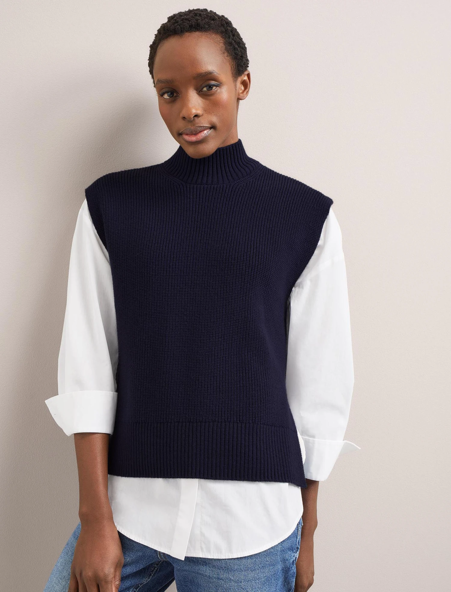Our hero Janice sleeveless jumper is the ultimate on-trend layering piece for your spring wardrobe. Throw on over a dress, blouse or shirt to stay warm without hiding a pretty sleeve or wear over a tee on summer days. It’s also brilliant under a jacket as it’s not bulky and you don’t need to worry about sleeve bunching. The longer length and dipped hem create an elegant shape plus it’s machine washable too – what’s not to love?
