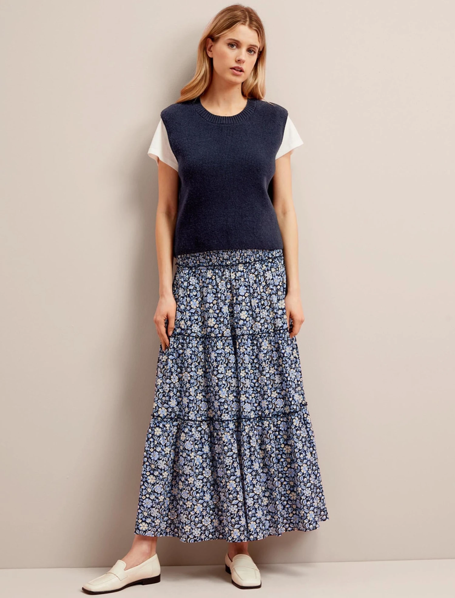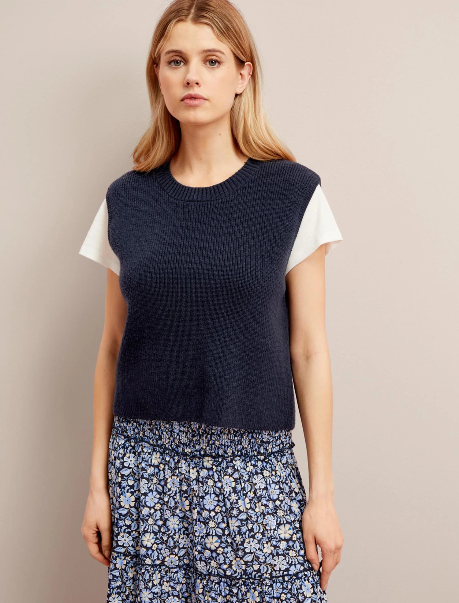 A versatile and lightweight alternative to our winter vest knits, Julie is designed in a cotton-and-merino blend that’s soft to the touch and cool on the skin. The wider shoulders and boxier fit mean it can be worn alone or layered over a T-shirt, crisp shirt or silky blouse.
