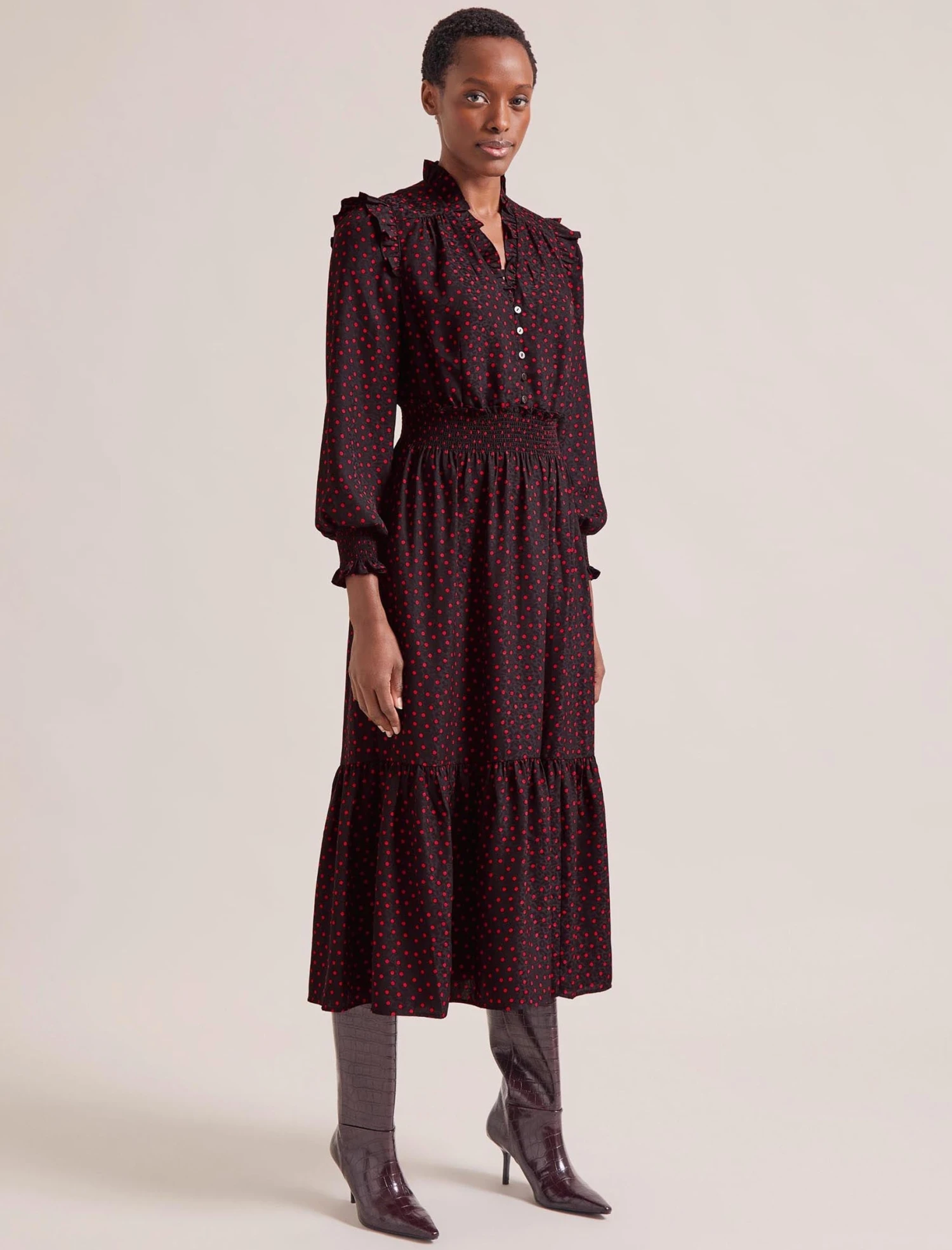 Miss the ease of summer’s throw-on-and-go dresses? Well, Saskia is your cool-weather alternative. Designed in a polka-dot-print jacquard with elevated detailing, it has a shirred waist and billowy sleeves for effortless everyday wear. Stash it in your commuter bag, throw it on as you’re racing out of the door, pack it for a work trip… no sweat: Saskia is crease-resistant and machine washable.