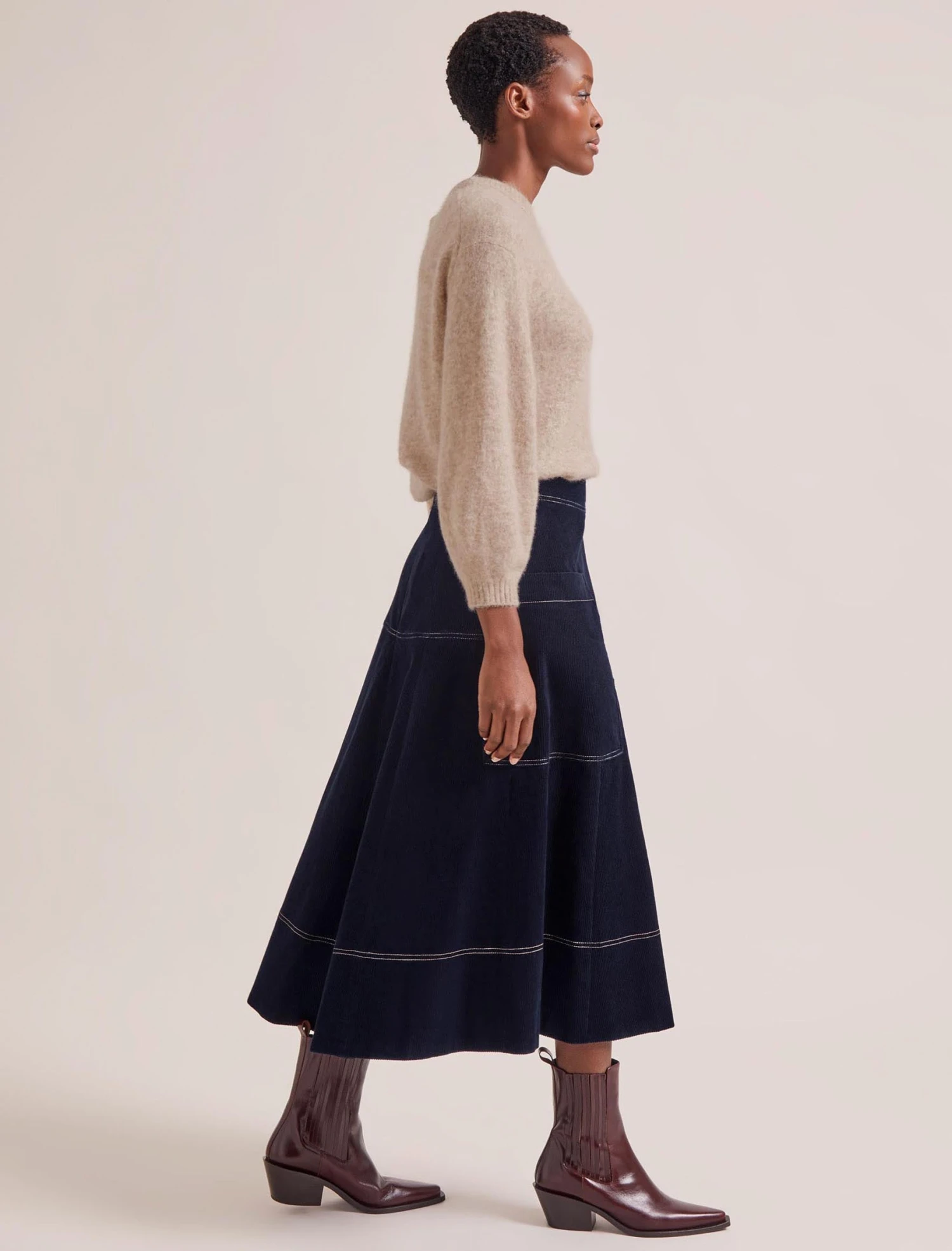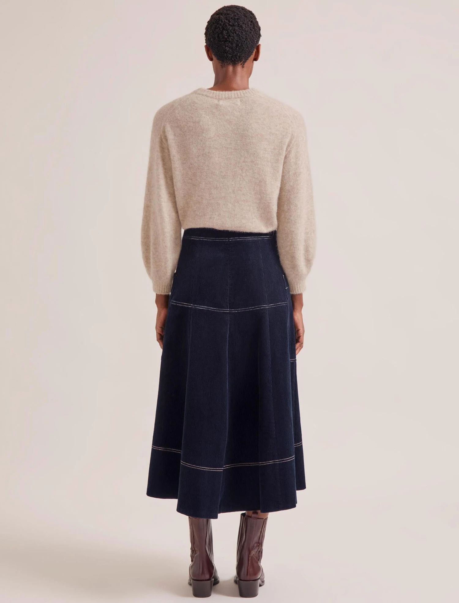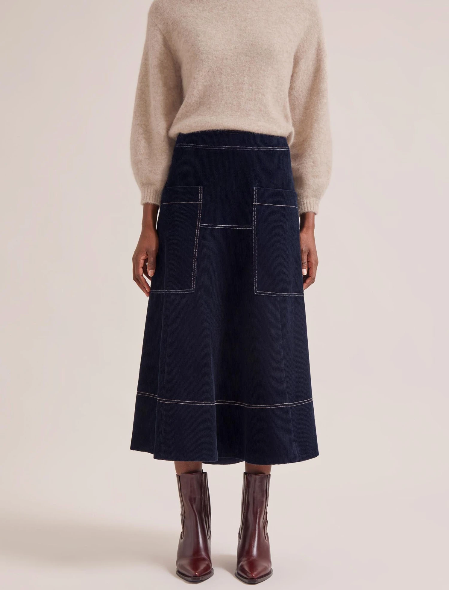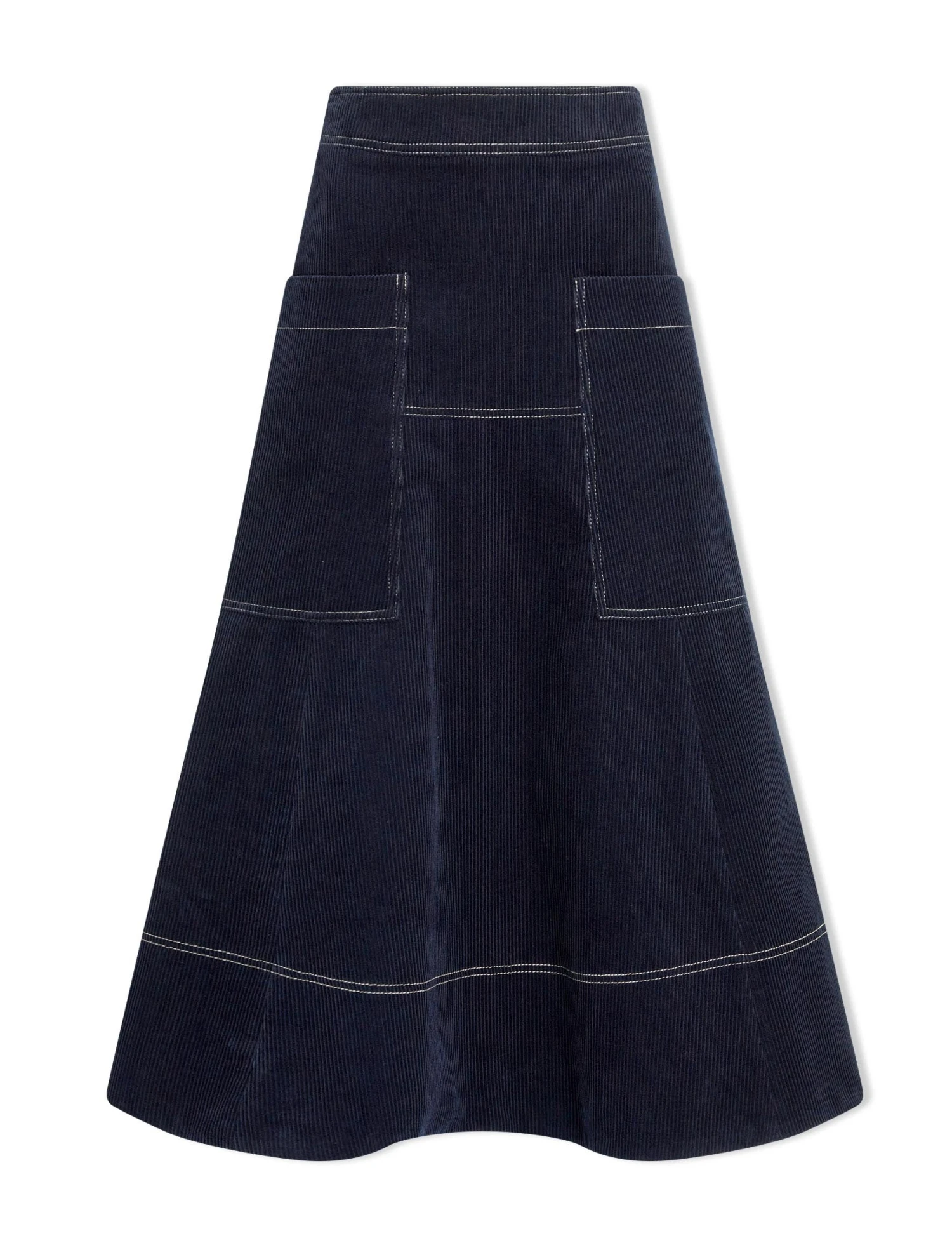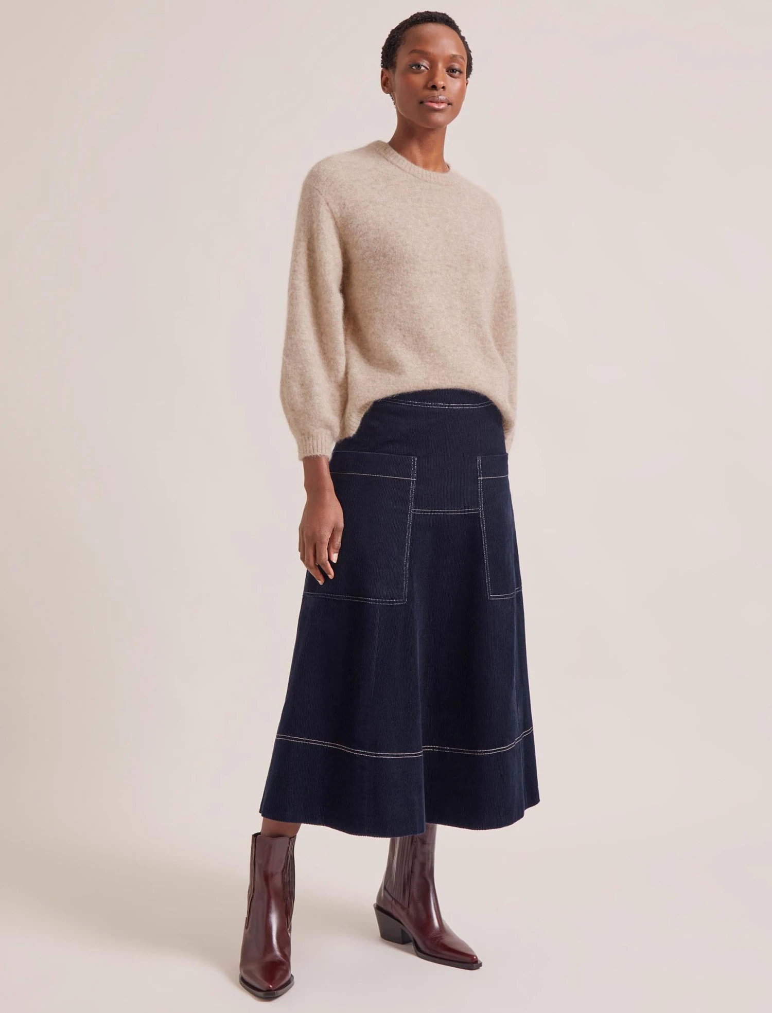 With 90s cargo trousers and skirts continuing to enjoy the fashion spotlight, our Simone maxi skirt offers a luxe twist. Cut from 100% organic cotton corduroy, it has the trend’s signature oversized patch pockets and contrast overstitching. Complement the stitching with one of our beige knits – cue Janice or Janie – and a trainer and that’s your downtime days sorted.