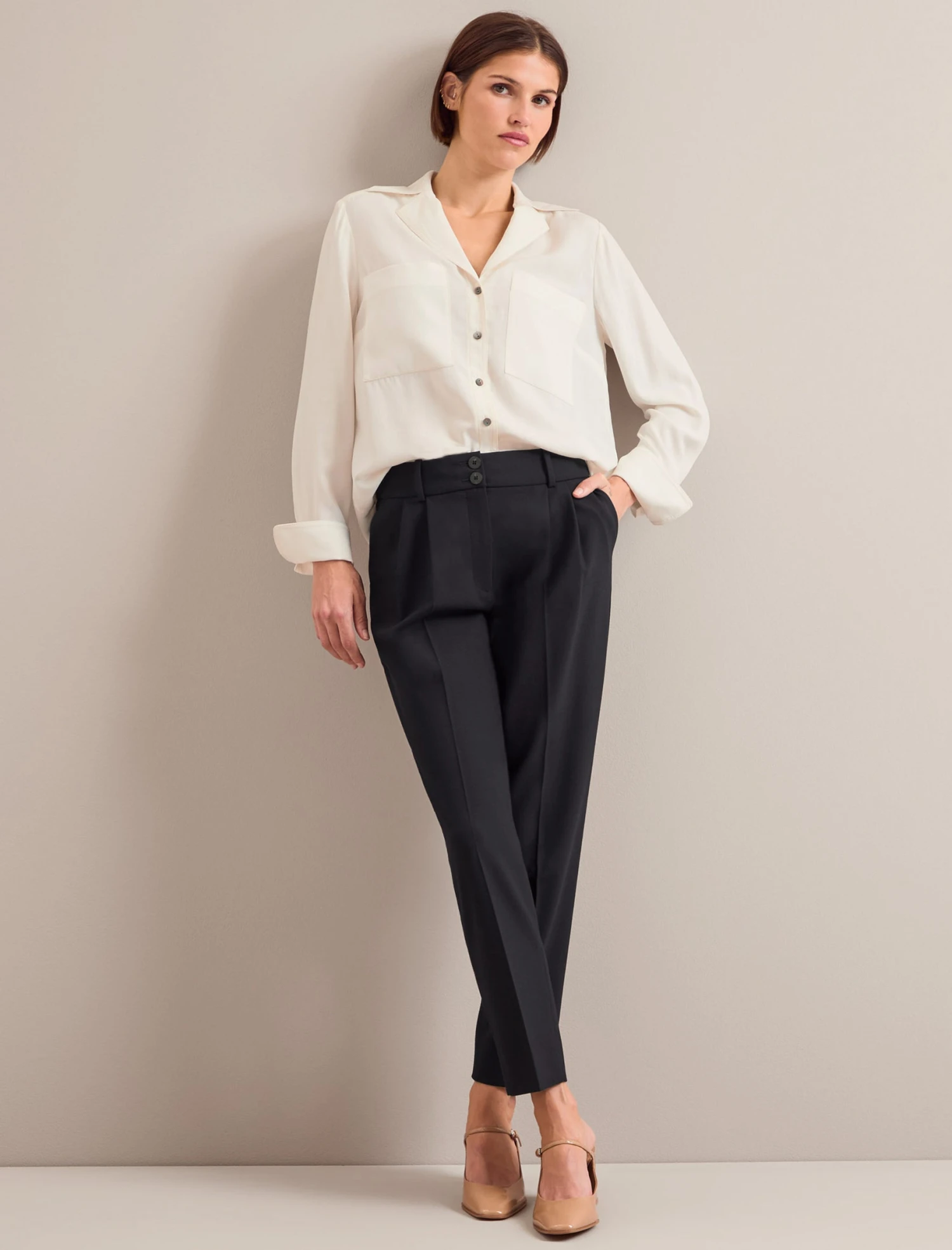 A cream silk shirt is a true wardrobe hero and Spencer will add androgynous cool to just about anything you wear it with. Cut in a matte washed silk that is beautifully soft and drapey, the on-trend 70s-style collar delivers a flattering neckline and the deep cuff can by folded back for a relaxed luxe look.