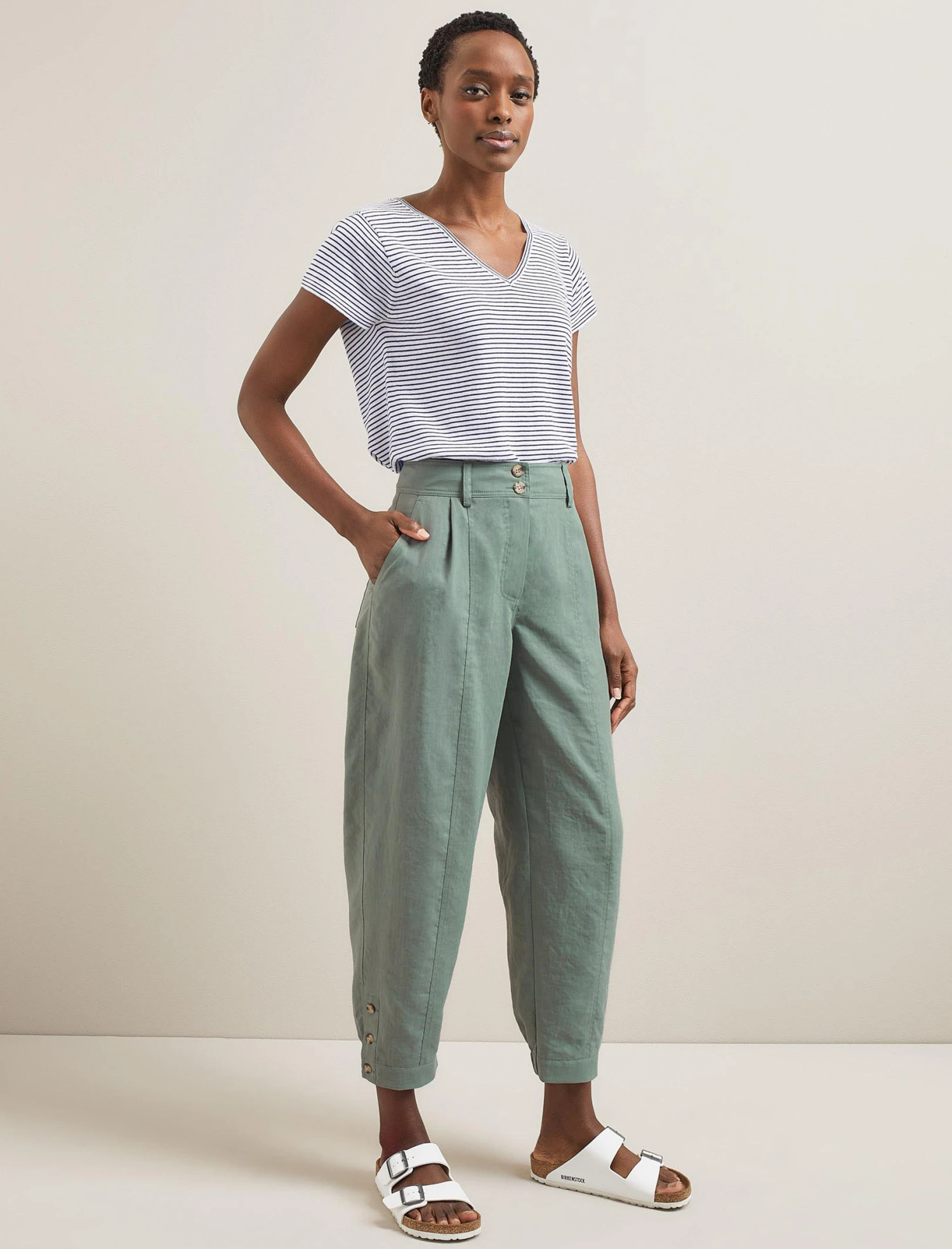 A high-waisted, pleated trouser is a smart addition to your wardrobe and the Tyson brings practicality to boot. Designed in our innovative Techni-Linen fabric, the barrel leg will hold its shape and look as good at the end of the day as the start. A shirred elasticated back waistband makes it comfortable for everyday wear, while the ankle-length summaryed cuff opens footwear options – a heel, loafer, sandal or trainer all work.